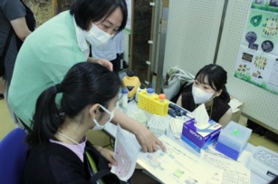 「研究者・技術者と話そう」というポスター展示プログラムでは、学協会・企業の全37団体が出展し、それぞれの分野の魅力を伝えた。日本農芸化学会は「身近で役立つバイオの主役!農芸化学」と題し、農芸化学の特徴と魅力を紹介すると共に、酵素や微生物による触媒活性を可視化する実験を通じて、日常生活に結びつく農芸化学分野の研究の日常生活への結びつき体感してもらった。