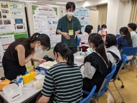 日本農芸化学会からは八波利恵博士(東京工業大学 生命理工学院 准教授)と亀谷将史博士(東京大学 農学生命科学研究科 助教)と、中高生と世代が近い TA として仙波玲奈氏(東京工業大学 生命理工学院 学部4年)と中川仁一朗氏(東京大学 農学生命科学研究科 修士1年)が参加した。