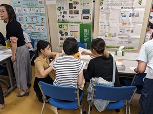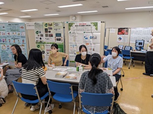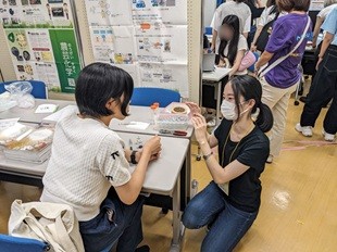 「研究者・技術者と話そう」というポスター展示プログラムでは、学協会・企業の全37団体が出展し、それぞれの分野の魅力を伝えた。日本農芸化学会は「身近で役立つバイオの主役!農芸化学」と題し、農芸化学の特徴と魅力を紹介すると共に、酵素や微生物による触媒活性を可視化する実験を通じて、農芸化学分野の研究と日常生活との結びつきを体感してもらった。なお、ポスター展示は、前半・後半の2部構成となっており、前半は「ポスター展示」のみ、後半では「ポスター展示」と「進路・キャリア相談カフェ」が並行して行われた。これは、「ポスター展示」と「進路・キャリア相談カフェ」のいずれも時間延長を求める声が多かったための今年からの措置である。