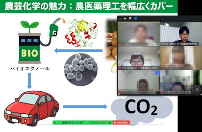 日本農芸化学会は「身近で役立つバイオの主役!農芸化学」と題し、酵素・微生物実験を書画カメラで演示しつつ、タンパク質分子の3D 表示やスライド資料を駆使して、農芸化学の特徴と魅力について紹介した。対面に比べて、生徒達からの質問やコメントを引き出すのが難しかったが、複数の生徒から異口同音に、次の様な質問が挙がった。