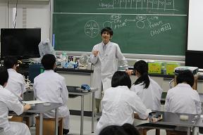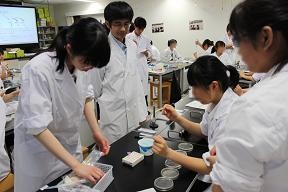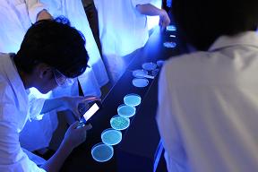 | 内容・目的 | 「形質転換実験」 pGLOバクテリア遺伝子組換えキット(Bio-Rad社)を使用し、外来遺伝子(GFP遺伝子)を有するプラスミド(pGLO)を大腸菌に形質転換して、その遺伝子の発現を観察した。 「遺伝子発現の観察」 pGLOを形質転換した大腸菌を前日に平板に塗布後培養し、実験当日平板(約600コロニー/プレート)を4分画して誘導物質であるアラビノース溶液を授業実施6時間前と3時間前に滴下した。授業開始時に生徒が残りの2区画のうちの1区画にアラビノースを滴下し最後に残った区画を対照として培養し、授業終了前にGFPの発現をブラックライトにて観察した。 「手指常在細菌の培養」 生徒全員に事前に準備しておいた寒天平板を渡し、手指に付着している常在細菌の培養を行った。翌日にその結果を観察した。 「出前講義」 「組換えDNA技術がもたらした生命科学・医学研究への影響」と題して、今回の出前授業の総括的な講義と、組換え技術の応用に関して話題を提供した。 |