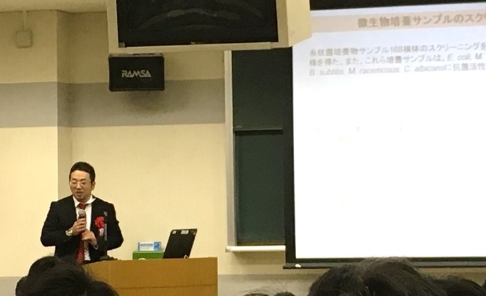 はじめに産学官学術交流委員会 三輪委員長より挨拶があった後、第14回農芸化学研究企画賞受賞者による研究企画発表会がありました。今回採択された研究提案は以下の3件でした。いずれの講演も産業的にも学術的にも興味深く、今後の展開が楽しみな内容でした。