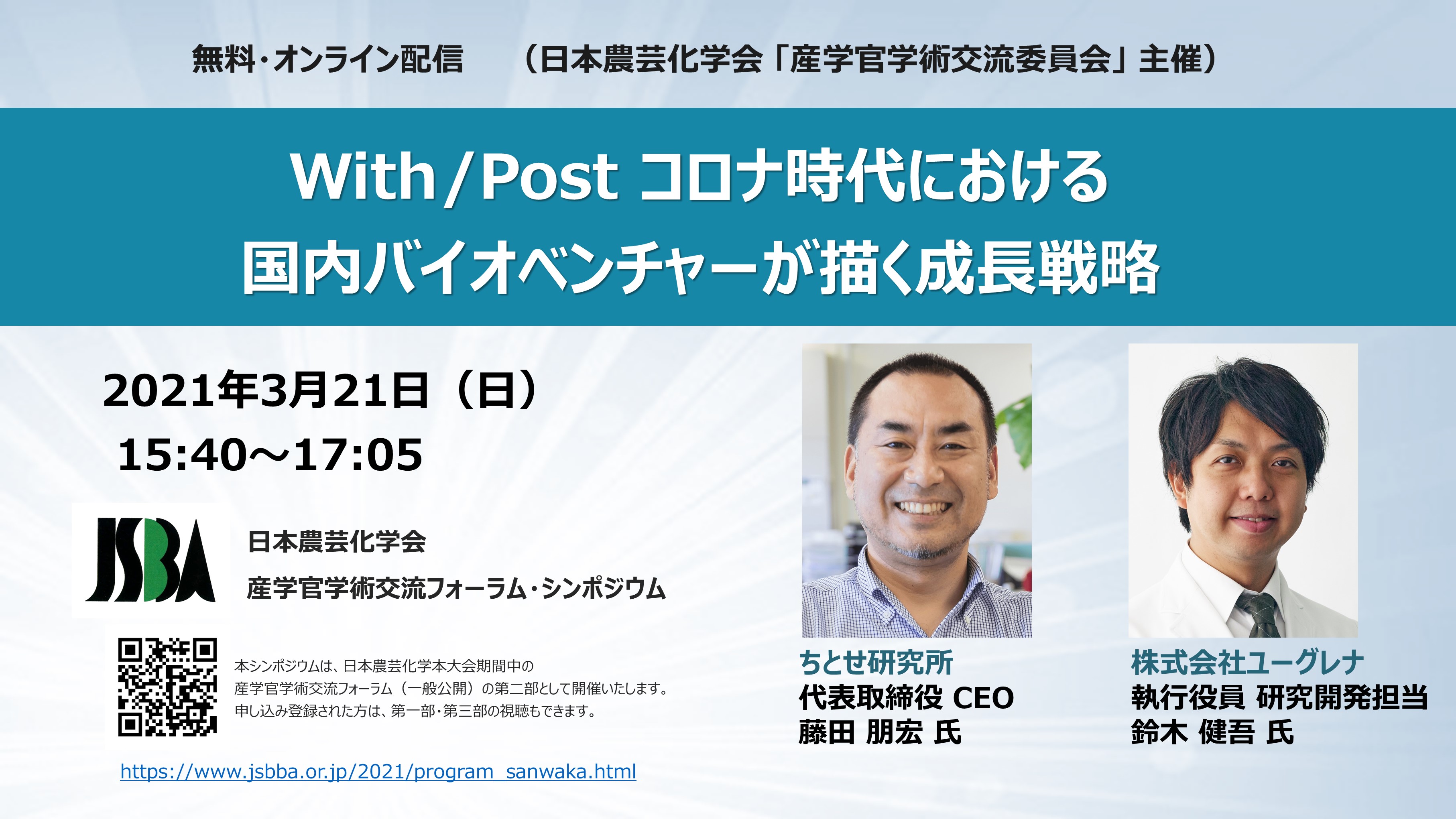 第二部はシンポジウムを開催します。本年度は「With/Post コロナ時代における、国内バイオベンチャーが描く成長戦略」と題し、バイオベンチャーの研究トップであるシンポジストから、ご自身の経験をもとに新たな時代に向けて、若手研究者・学生への激励メッセージを語っていただきます。