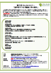 | 参加申込 | 件名を「さんわかセミナー参加申し込み」とし、 ・氏名 (学生の場合はその旨を明記して下さい) ・所属 ・連絡先メールアドレス ・交流会参加の有無 をE-mailにて、下記のアドレスへご連絡ください。 ※申し込み先着順で定員に達し次第、締め切りとさせていただきます。 ※お申込みいただいた個人情報は、参加確認および今後のさんわかセミナーのご案内以外の目的には使用いたしません。 |