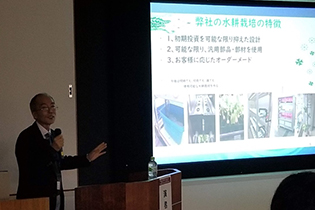 - 神楽田徳夫先生(株式会社KAGURADA)からは、低コスト・省スペースでの水耕栽培システムについて、スマートアグリで先行するオランダ農業での実例や、水耕栽培と水産養殖を組み合わせたアクアポニックス技術などの紹介を交えながら説明頂きました。先生ご本人の水耕栽培にかける情熱があふれる印象的なご講演でした。