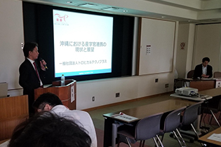 - 岩本竜吾先生(一般社団法人トロピカルテクノプラス)からは、沖縄県が持つ優位性(東アジア主要都市への玄関口に位置付けられるという地理的特性・全国一高い出率・豊かな自然環境など)を活かし、民間主導で自立型経済を発展させていくための国や県の沖縄振興計画について説明して頂きました。特に、沖縄振興計画の一つである健康バイオ企業の事業促進支援の一例として、沖縄健康バイオテクノロジー研究開発センター/沖縄バイオ産業振興センターでの、バイオベンチャーのインキュベーションや産学官連携推進の取り組みをご紹介頂きました。