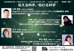| プログラム | 13:00 開会 13:05~13:45 「TogoTV: バイオインフォマティクスツールとデータベースの動画教材・資料および生命科学イラストのためのポータルサイト」 小野 浩雅 氏(大学共同利用機関法人 情報・システム研究機構 データサイエンス共同利用基盤施設 ライフサイエンス統合データベースセンター (DBCLS) 特任助教) 13:45~14:25 「古生物学の研究活動とアウトリーチ活動:何のために研究し、何のために成果を発信するのか?」 相場 大佑 氏(公益財団法人深田地質研究所 研究員) <休憩> 14:45~15:25 「研究成果を広く伝えるためのサイエンスイラストレーション」 木下 千尋 氏(農学博士・イラストレーター) 15:25~16:05 「世の中に必要とされるサイエンスコミュニケーションと、それを担うために必要な能力について」 寒竹 泉美 氏(理系ライター・小説家) 16:10 閉会 |